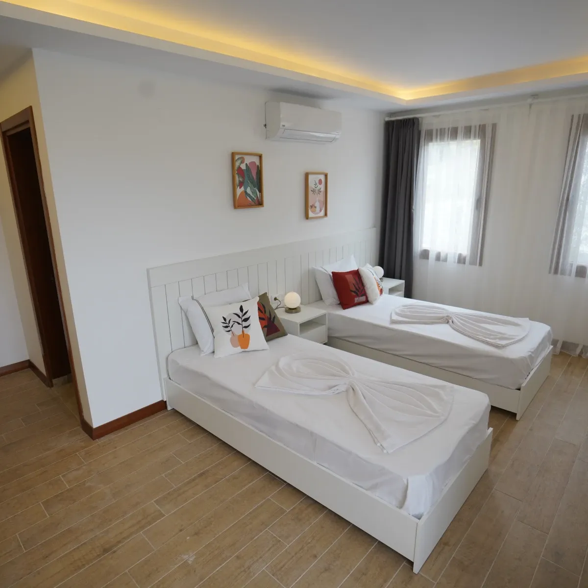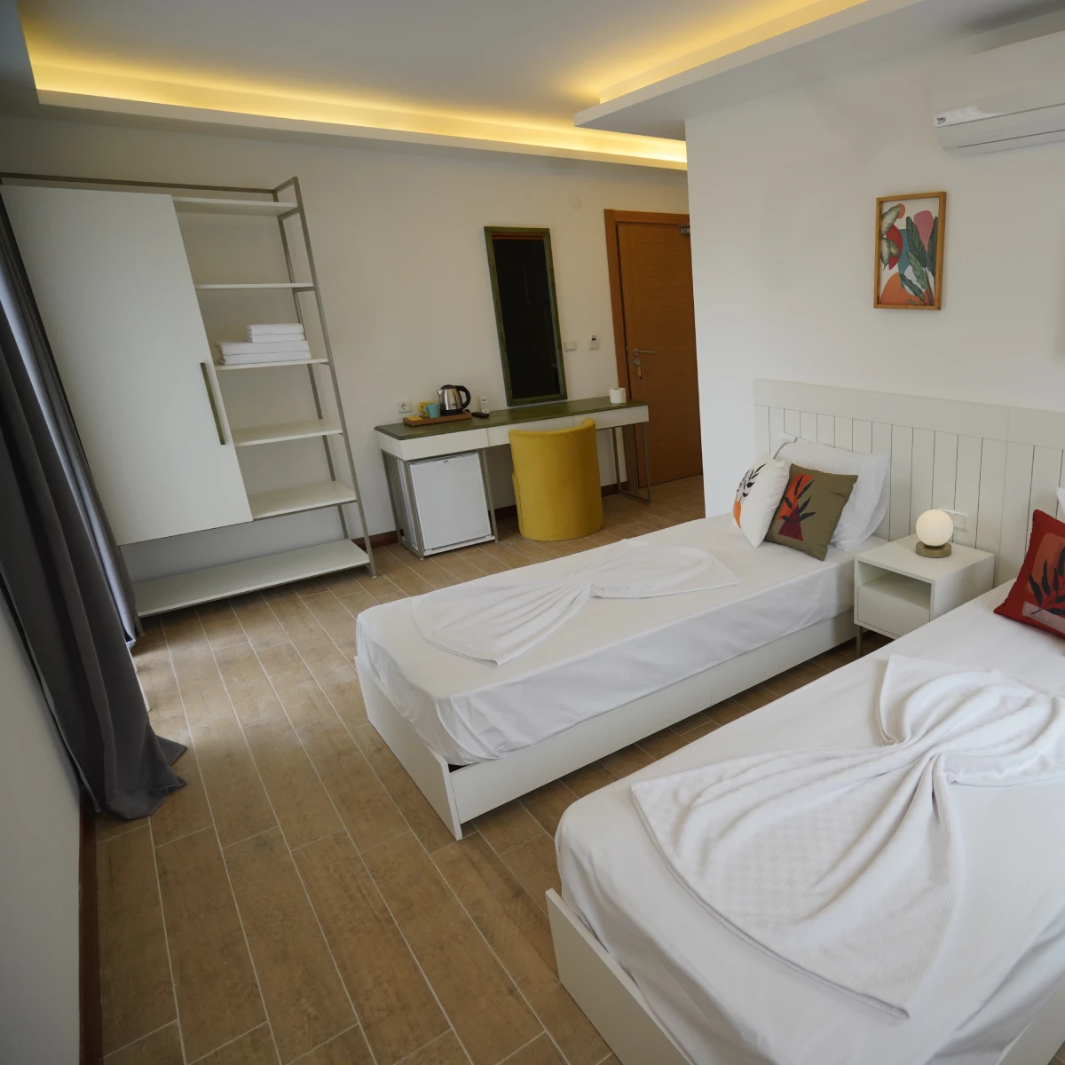 İç mekânda kullanılan doğal dokular, ahşabın sıcaklığı ve sade detaylarla birleşerek ferah ve dengeli bir atmosfer yaratır. Geniş alan hissi veren yerleşim planı sayesinde odada geçirdiğiniz her an rahatlatıcı bir deneyime dönüşür. Balkon, günün her saatinde doğayla baş başa kalabileceğiniz özel bir kaçış noktası sunar.